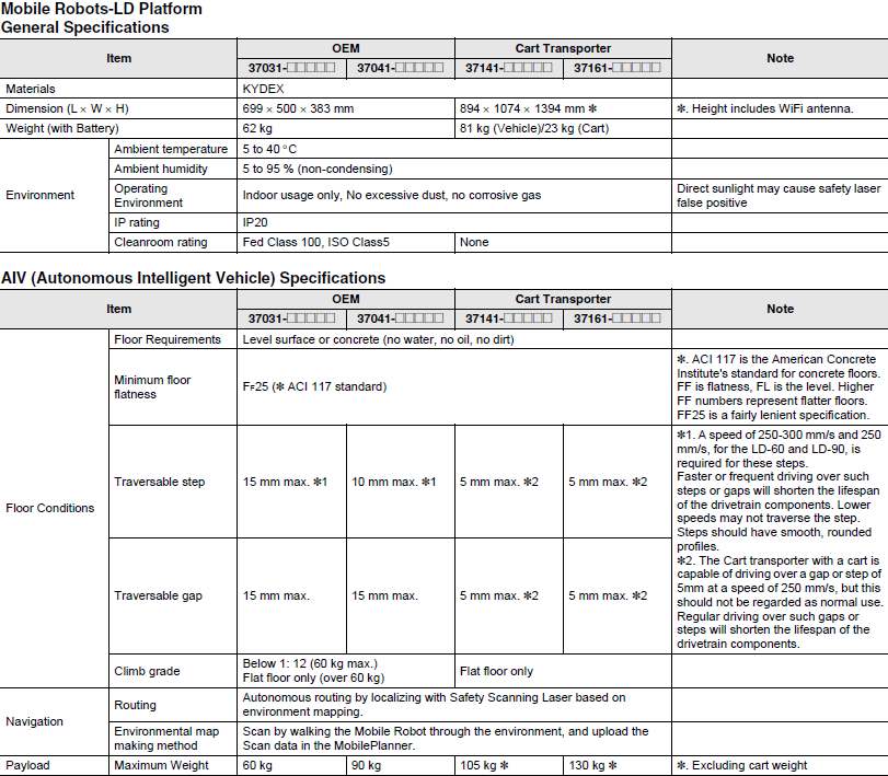 The Omron LD Mobile Robot is a self navigating Autonomous Intelligent Vehicle (AIV) designed for dynamically moving material in challenging environments that may include confined passageways as well as dynamic and peopled locations. Unlike traditional autonomously guided vehicles (AGVs), Omron Mobile Robot requires no facility modifications, such as floor magnets or navigational beacons, saving users up to 15% in deployment costs. The LD includes Omron’s proprietary software and controls allowing it to intelligently navigate around people and unplanned obstacles, that render traditional AGVs incapacitated and it can be programmed and functional within a day. Designed for developers, integrators, and end-users the system can be customized for a variety applications and payloads. Manufacturing, warehousing, clean tech, and laboratories are just a few environments ideal for the mobile robot.Product Features
