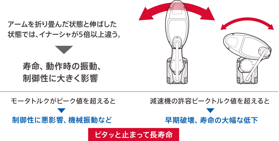 動作開始時のアーム姿勢と動作終了時のアーム姿勢から、最適な加速度、減速度を自動で選択します。