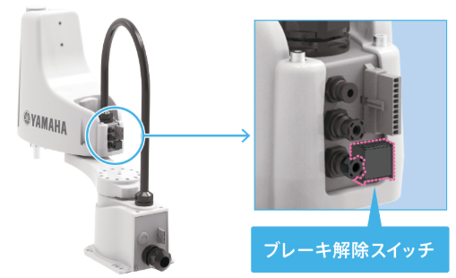 非常停止状態で「ブレーキ解除スイッチ」を押している間、Z軸ブレーキが解除され、Z軸を上下に動かすことができます(スイッチを離すとZ軸にブレーキがかかります)。 設置調整時の利便性が向上します。