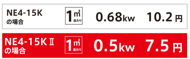 ※消費電力はコンプレッサ搭載のモータの公称出力に基づき、最大流量を使用した場合の値です。1㎥当たりの単価は電気代を15円kWとし、保守費用を含まない価格です。