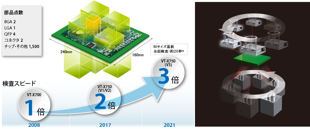 EV、5Gの技術進化により電子基板の小型化、高密度化(両面)、BGA、LGAの搭載が増加し、求められる検査難度は急激に高まっています。そして、工程保証やX線解析機での抜き取り確認から、X線での全数検査が求められるなど、市場の品質要求も高まり続けています。