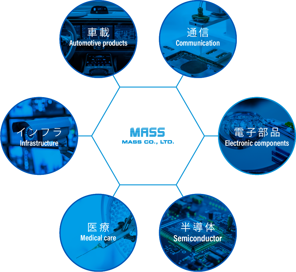マス商事は、製造業をはじめ、自動車、食品、医薬品、エネルギー、物流など、さまざまな業界との取引実績があります。図に示すように、多岐にわたる分野で信頼を築き、お客様ごとのニーズに応じた最適な提案とサポートを提供しています。業種を問わず、ものづくりの現場を支えるパートナーとして選ばれています。